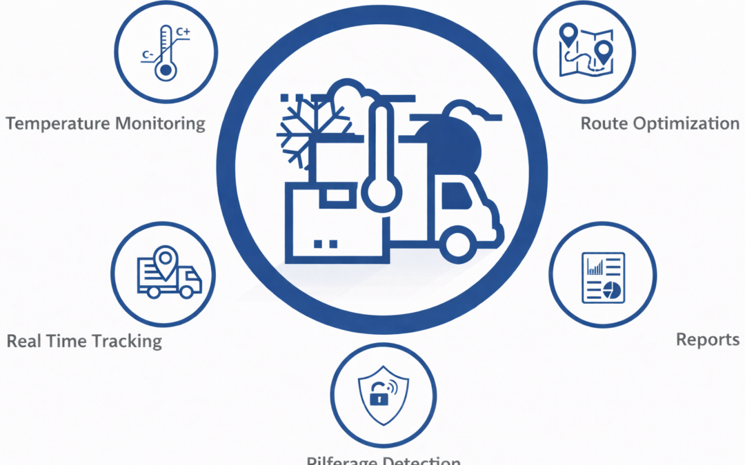 Receive alerts via SMS or Email in case of temperature variations, refrigerator compressor is ON or OFF, route deviations, tamper detection, containers door left open for a prolonged time or unscheduled stops.