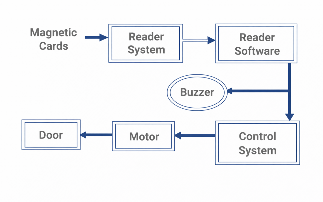 The magnetic card reader uses a specific component to read data from a magnetic card, which is referred to as the read head. The magnetic card reader is a microcontroller-based device. The read heads contain signal amplifiers and line drivers. All modern magnetic read heads contain integrated F/2F bit recovery circuitry and interface with the host controller.